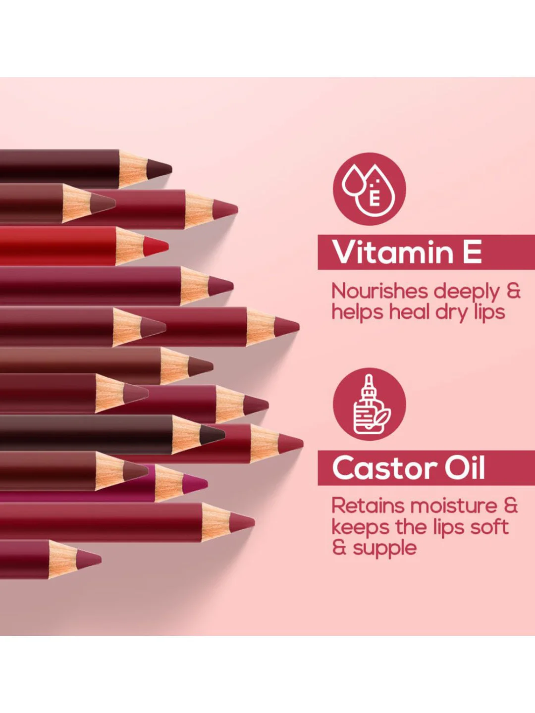Crafted with a smooth, creamy formula, these lip liners glide effortlessly across your lips, ensuring flawless application in just one stroke. Infused with Vitamin E and Castor Oil, the formula not only enhances color payoff but also nourishes and hydrates your lips, keeping them soft and comfortable all day long.